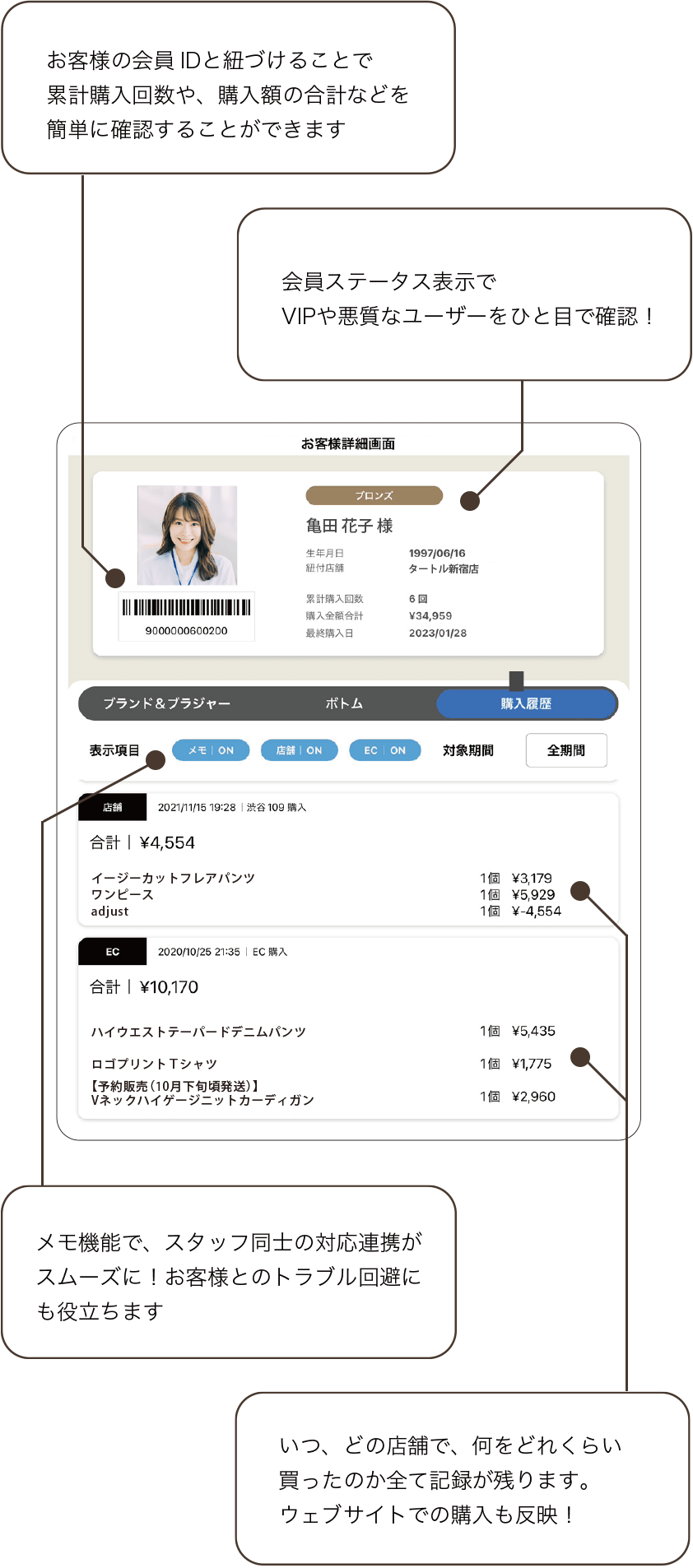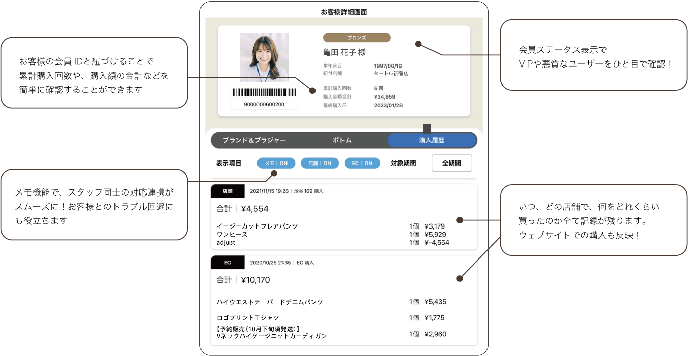 お客様ごとの好みや購入傾向などを全てのスタッフが把握することで、お得意様や新規のお客様への接客クオリティが均一に。新人育成にも役立ちます。