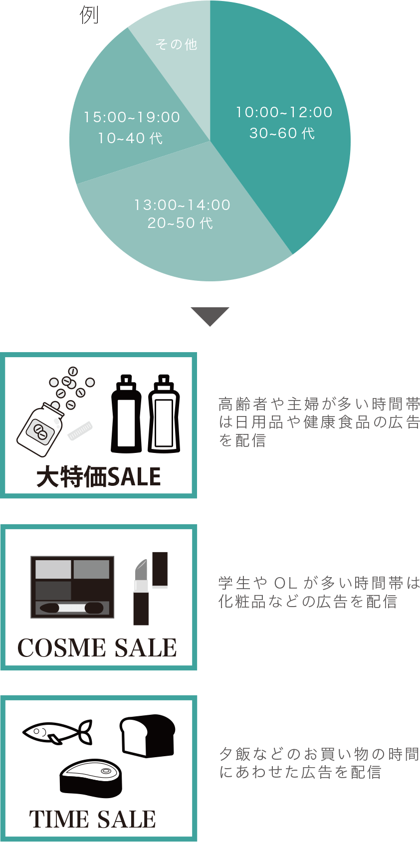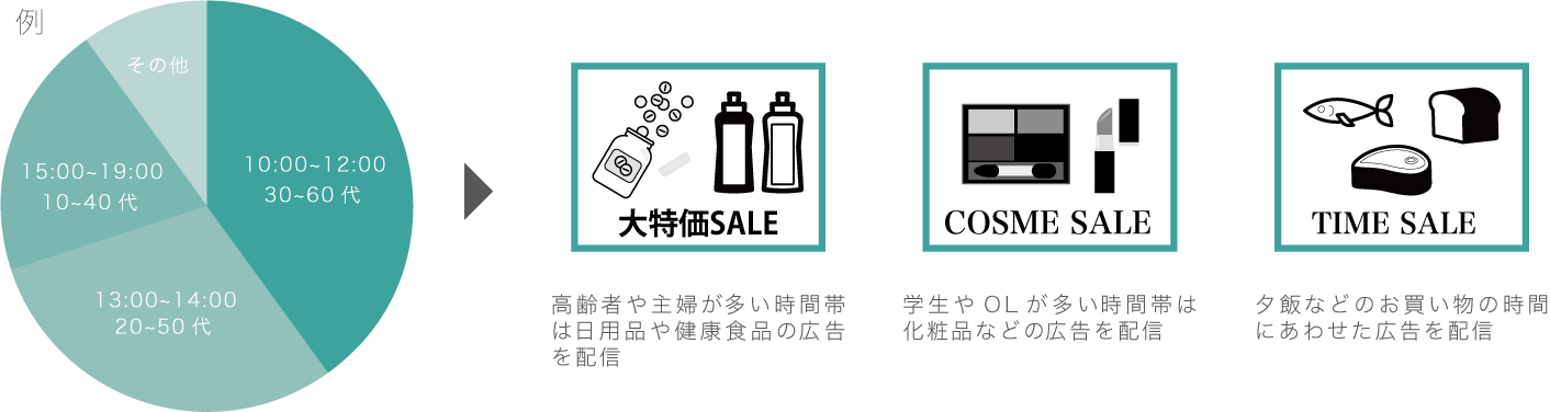 年齢/性別/来店時間/滞在時間など、正確なデータの収集・蓄積が可能。例えば「午前中は40代~70代の来店率が高い」「夕方はOLや学生が多い」など来店時間の年齢に合わせたVMDや広告などの販売促進ツールを的確にご活用いただけます。